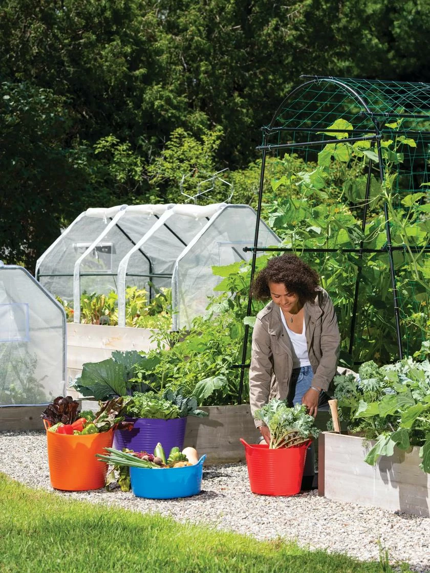 This 3-season protection tent is designed to fit right inside our Vermont-made 4′ x 8′ cedar raised beds. The greenhouse cover keeps plants warm on cooler spring and fall days, provides 70% light transmission, 40″ of head room at the peak, and has roll-up end windows for ventilation. A second cover protects against ravenous summer bugs and scorching sun. Three zippered doors on each cover provide easy access for tending and harvesting. Tie-downs secure the covers to the steel frame.