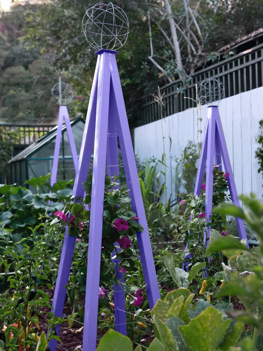 Create an instantly stylish garden with this contemporary obelisk topped with a sculptural stainless steel sphere by Terra Trellis. Use to train plants that climb or need support, or place in the garden for simple architectural punch. During the off-season, this tuteur becomes a striking work of art. Designed and hand-crafted in the U.S. from steel and stainless steel cable, finished in brilliant water-resistant powder-coated colors or a natural oxide patina. A sturdy structure for edible or ornamental gardens, great on the ground or on patios with containers. Very impactful in multiples.