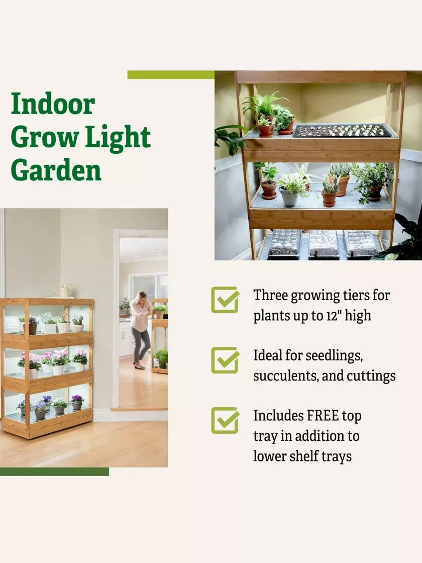 - Three growing tiers for plants up to 12″ high