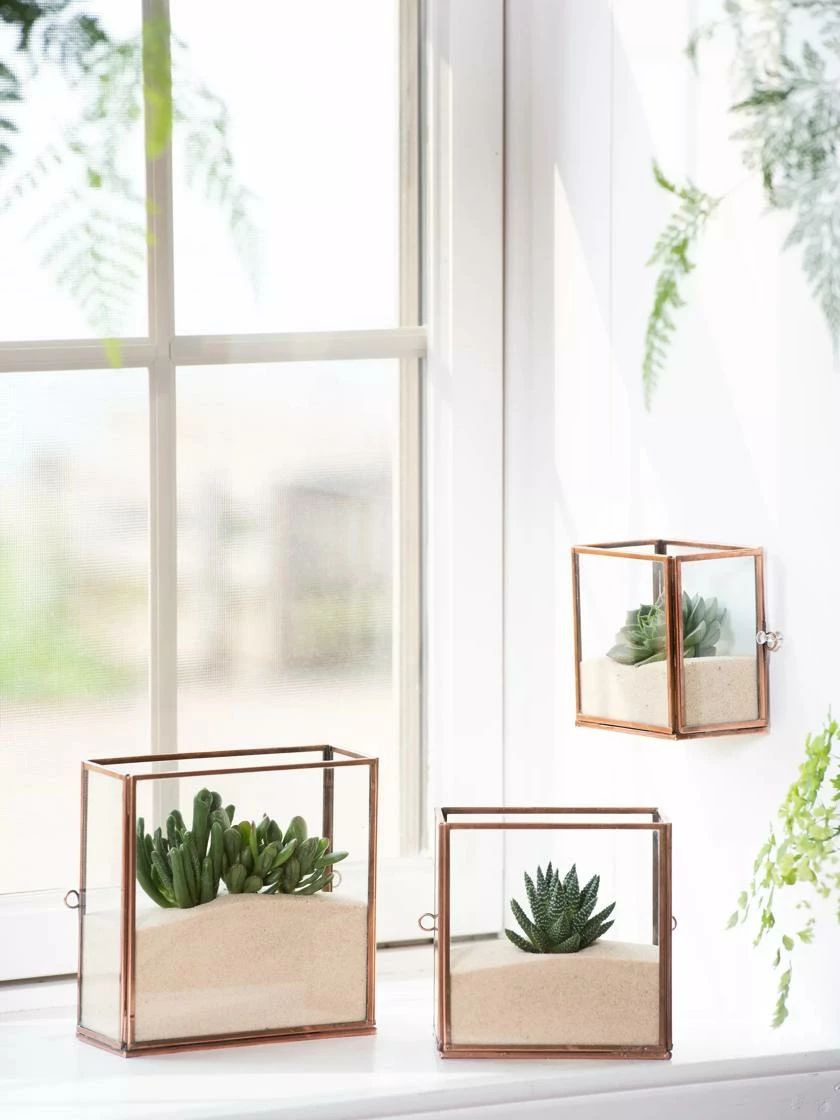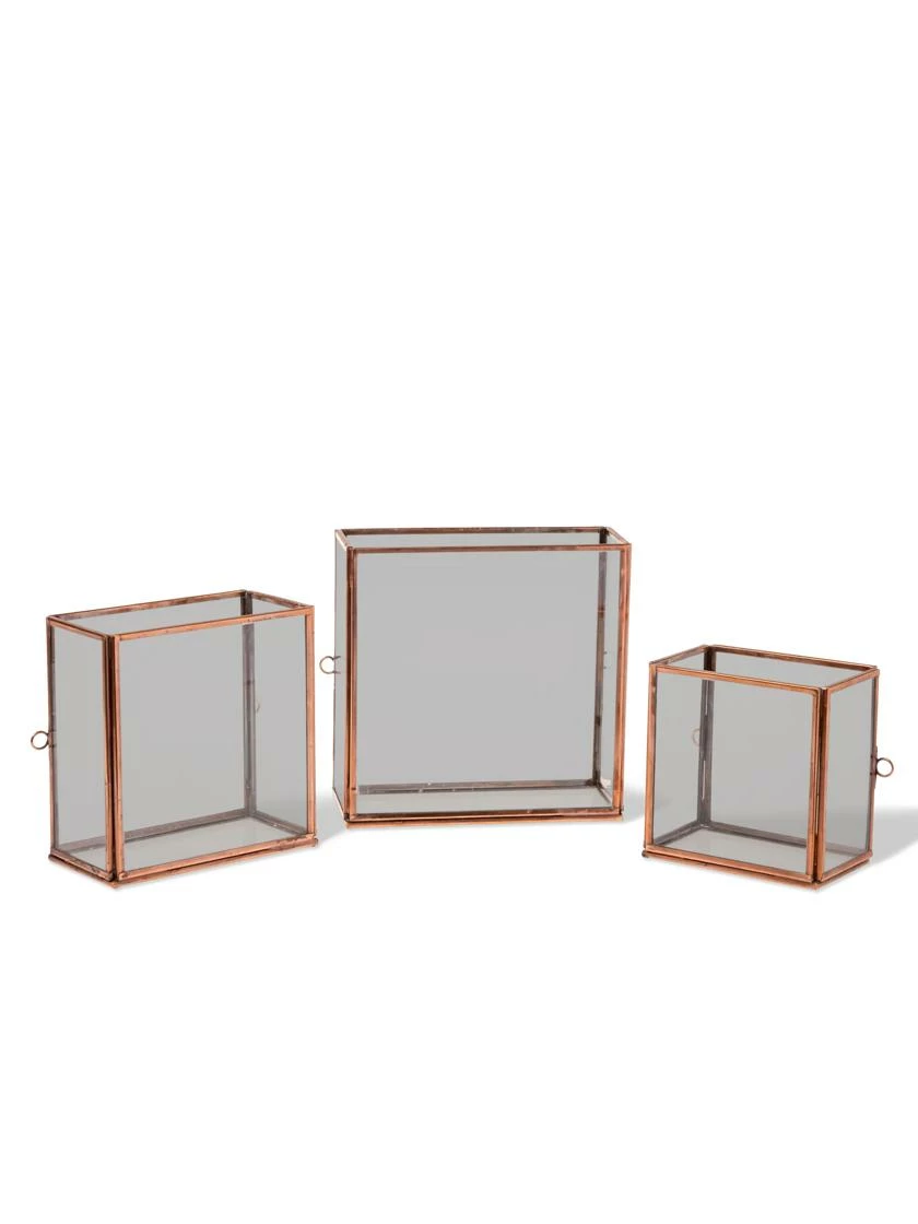 Create miniature gardens with this sweet copper-and-glass terrarium set. Unleash your creativity with three sizes, each of which has one side open for ventilation and easy access (no fussing with doors or hinges). Plants not included.