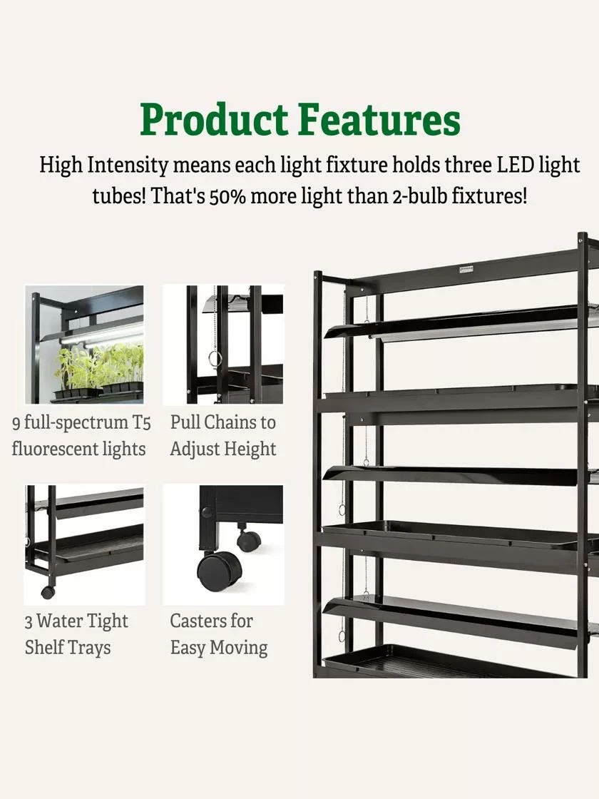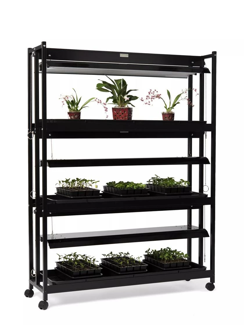 Each 4′ long fixture of this high-intensity light garden has three super-bright, full-spectrum T5 fluorescent bulbs, so it provides 50% more light than dual-bulb fixtures. Maximum light intensity is vital to growing orchids and other plants from seed all the way to flowering and fruiting. This grow light stand has a rugged, powder-coated, rustproof aluminum frame, and three growing shelves that provide plenty of room for seedlings and houseplants. The light fixtures easily adjust up and down as plants grow. Includes frame, light fixtures, T5 fluorescent bulbs, watertight trays and casters.