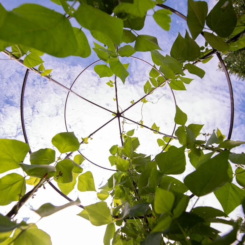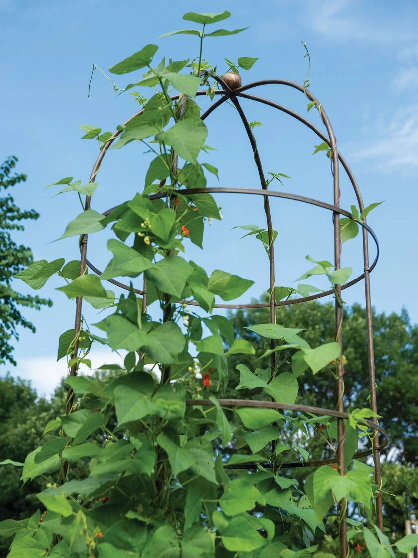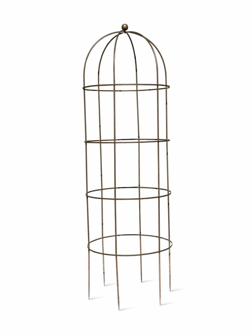 Make a statement in your garden with this towering plant support! A simple hoop frame with 6 vertical supports culminating in a birdcage-like spire, the Jardin Tower is thoroughly inspiring when filled in with summer’s vibrant vines. Beans, morning glories, and hops will feel humbled by this tower’s aspirational height — at nearly 8 feet, it’s so tall, even the most ambitious climbers may need a breather halfway up! Even without vines, the Jardin Tower adds character and visual interest to your garden. A hand-painted “aged” finish gives the tower a well-established look even newly-installed. The sturdy and long-lasting powder-coated steel frame is durable enough to stay outside all year round, providing a sculptural element when your garden is in dormancy. And when you’re busy “decking the halls,” you can brighten up your winter garden by decking out your Jardin Tower in garlands, lights, and other holiday decor. An enchanting element that keeps your garden exciting all year round, let the Jardin Tower take your green space to new heights!