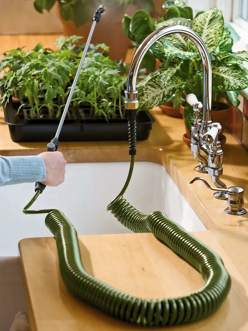 Attach this handy hose to the kitchen sink faucet to water houseplants and indoor seedlings. The 50′, 1/4″ diameter hose weighs about 2 lbs. and coils for easy transport and storage; comes with an attached 24″ wand that adjusts from a solid stream to a fine mist. Water flow rate is about 1/2 gallon per minute.