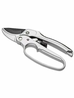 Ergonomic pruners have a ratchet action that reduces the effort required to cut through tough branches. Lightweight, rustproof aluminum with durable steel blades that stay sharp. A non-stick coating on the blade aids in quick release and smooth cutting.