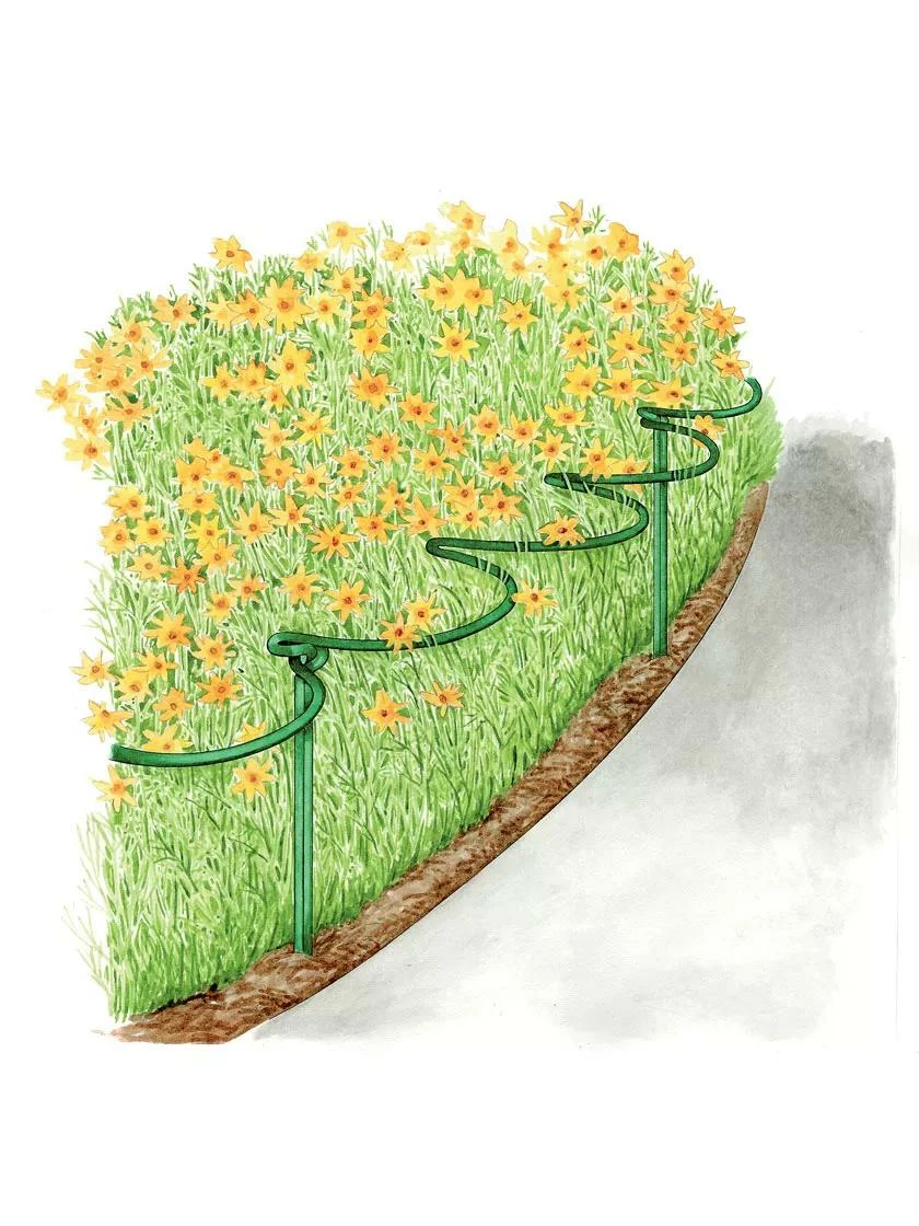 These extra-strong supports prop floppy plants to neaten borders and paths, and the scalloped shape lets plants drape more naturally than a straight support. Each three-scallop section has a stake at each end that loops securely through the next section, creating a very sturdy support.